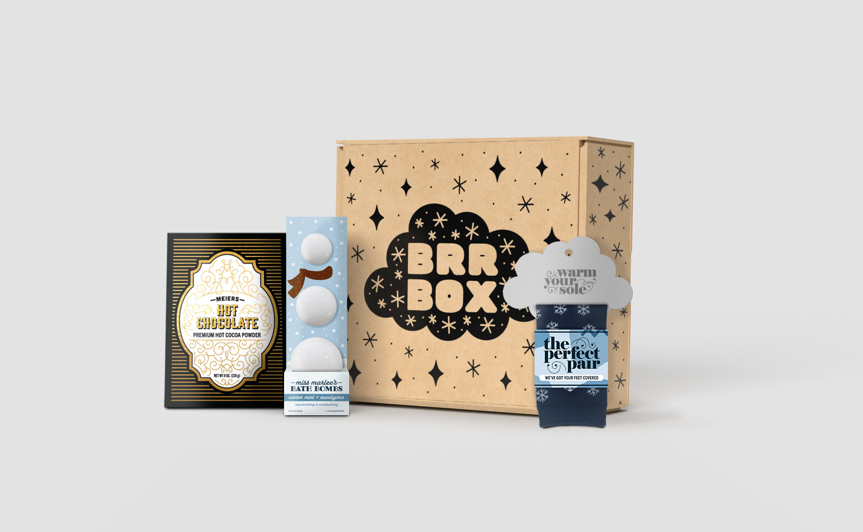 The visual identity behind BRR Box consists of fun little elements exploding all over the box. The main logo consists of a simple snow cloud illustration with the hand-rendered title “BRR BOX” inverted out.