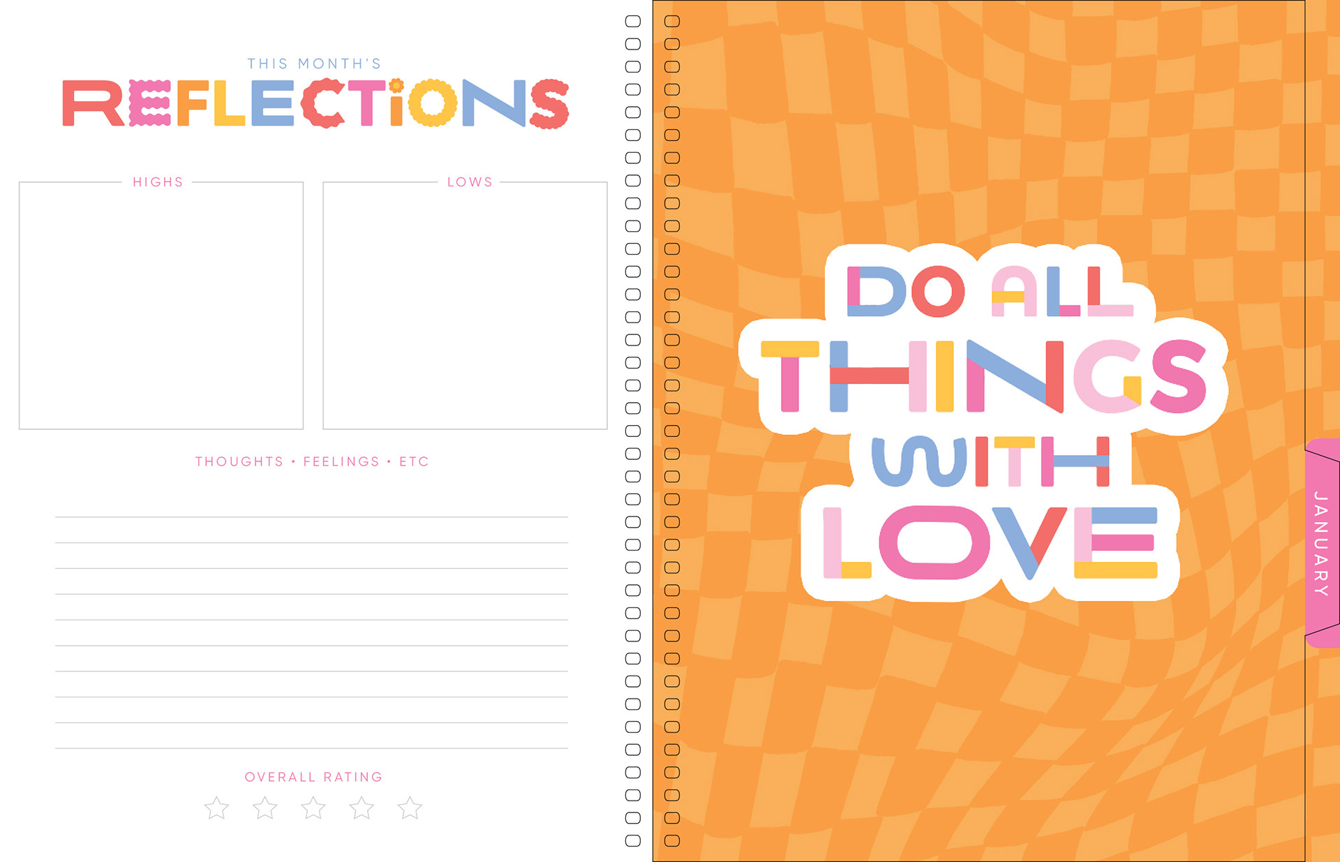 The designed portion of the planner consisted of the covers, a back folder, a hello page, a year-at-a-glance page, and eighteen unique dividers with corresponding monthly and weekly pages based on the template created by our planner brand, Agenda 52. I was able to use the template as a baseline while adding flair throughout the planner.